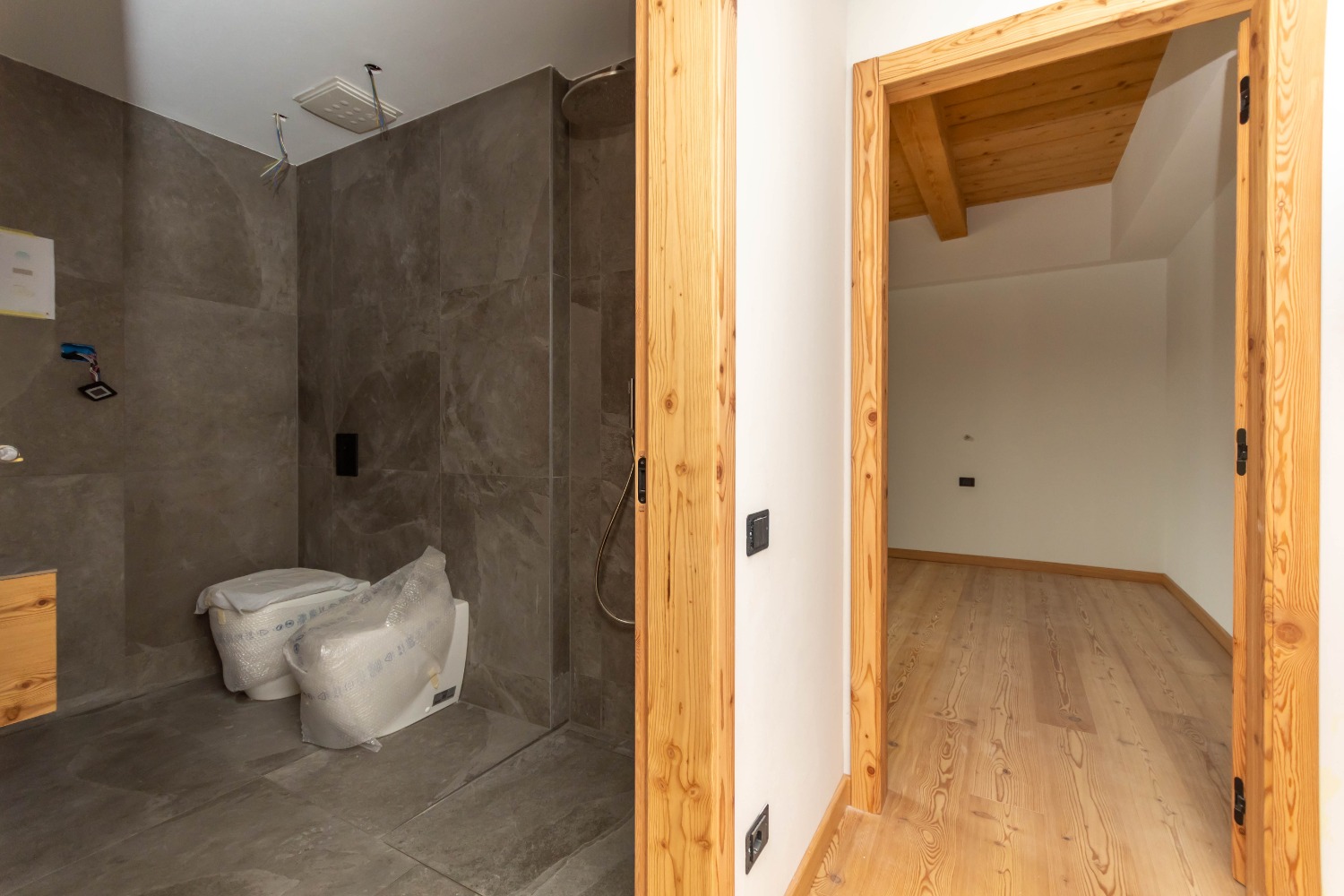 The bathroom, finished with high-quality materials, features a shower and benefits from a dehumidification system, ensuring a consistently comfortable and healthy environment.