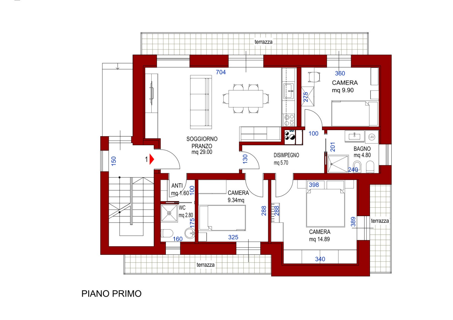 tre camere da letto, tutte con terrazzo,