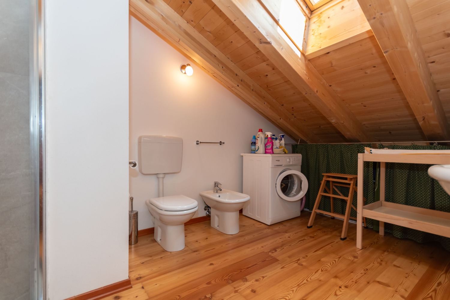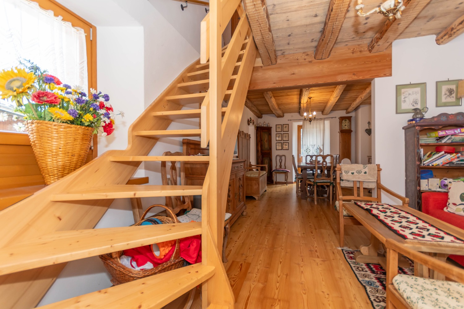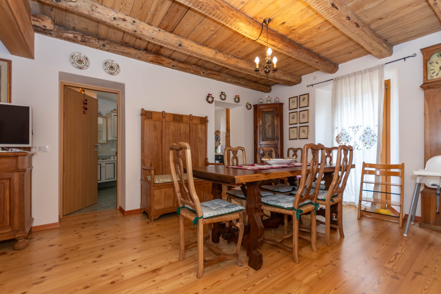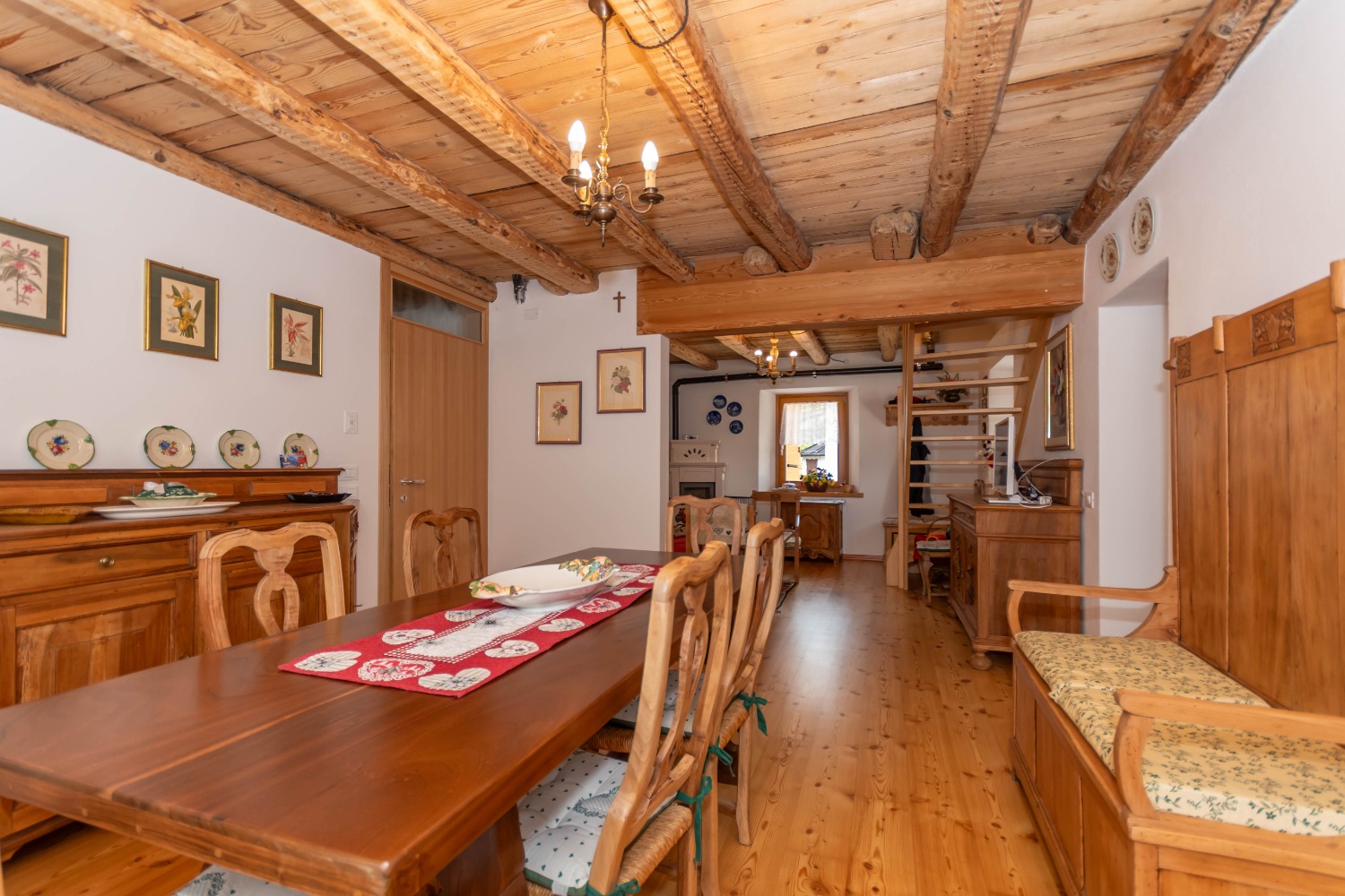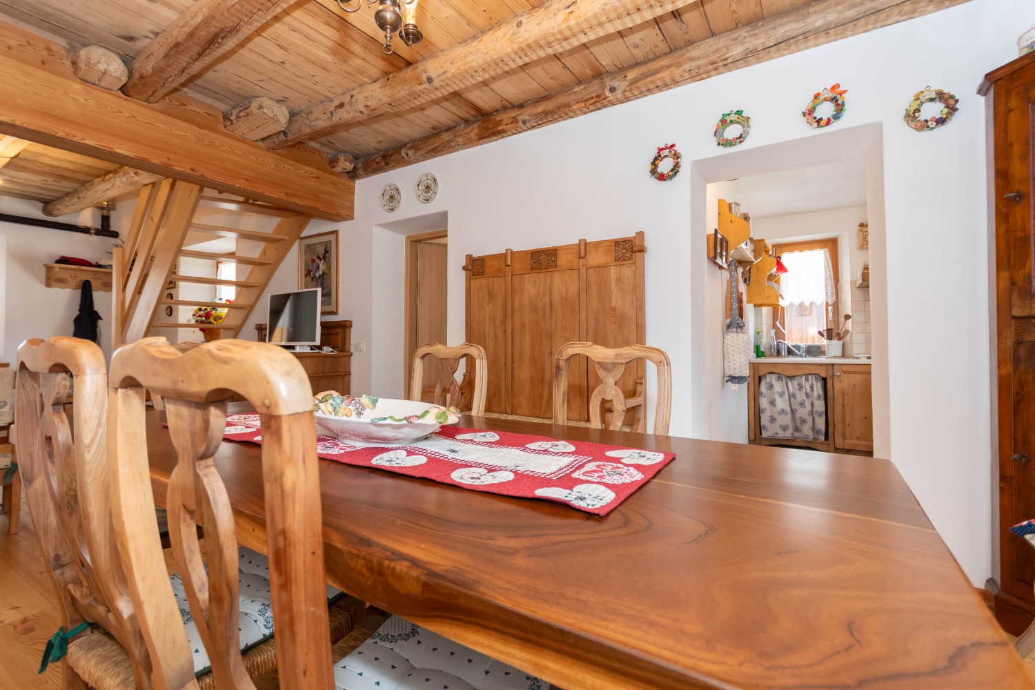 Dall’ingresso si accede a un ampio open space con accesso diretto al terrazzo: qui la zona pranzo e la cucina semi abitabile si affacciano su un caldo e accogliente soggiorno con travi a vista, impreziosito da una stufa a pellets. Sempre su questo piano troviamo un ampio bagno finestrato, pratico e funzionale.
