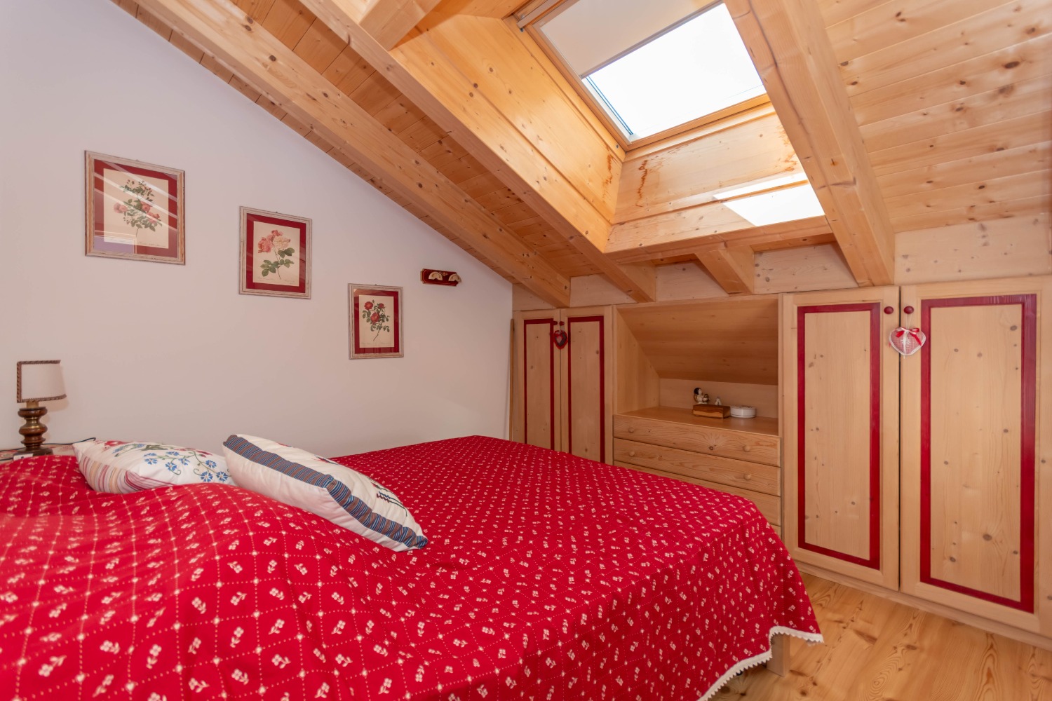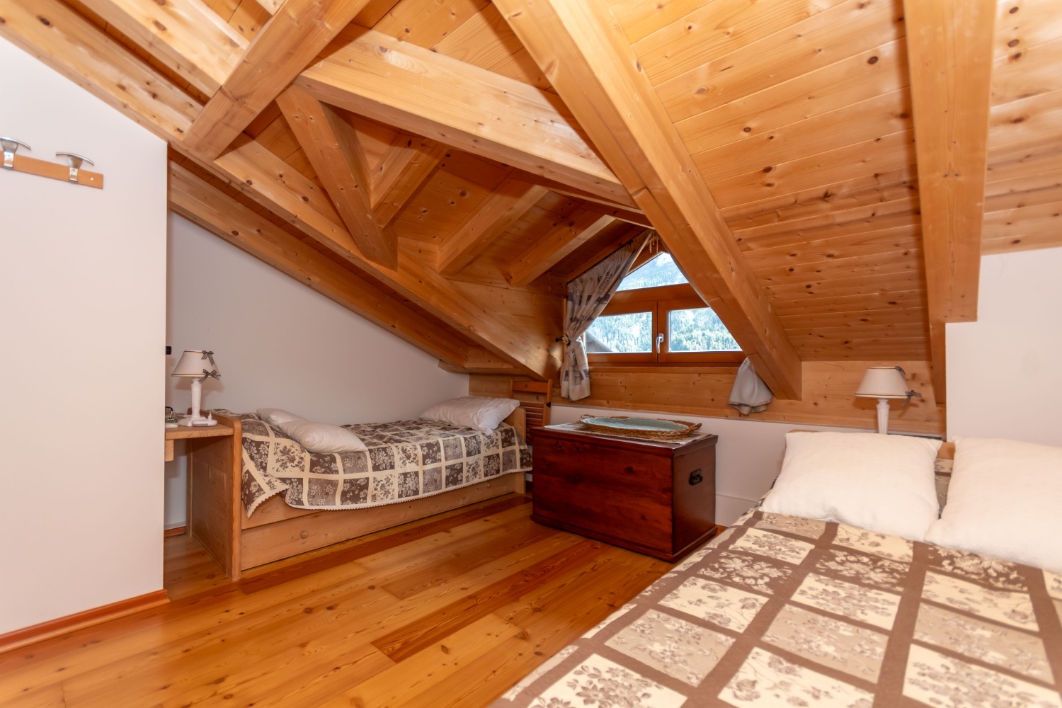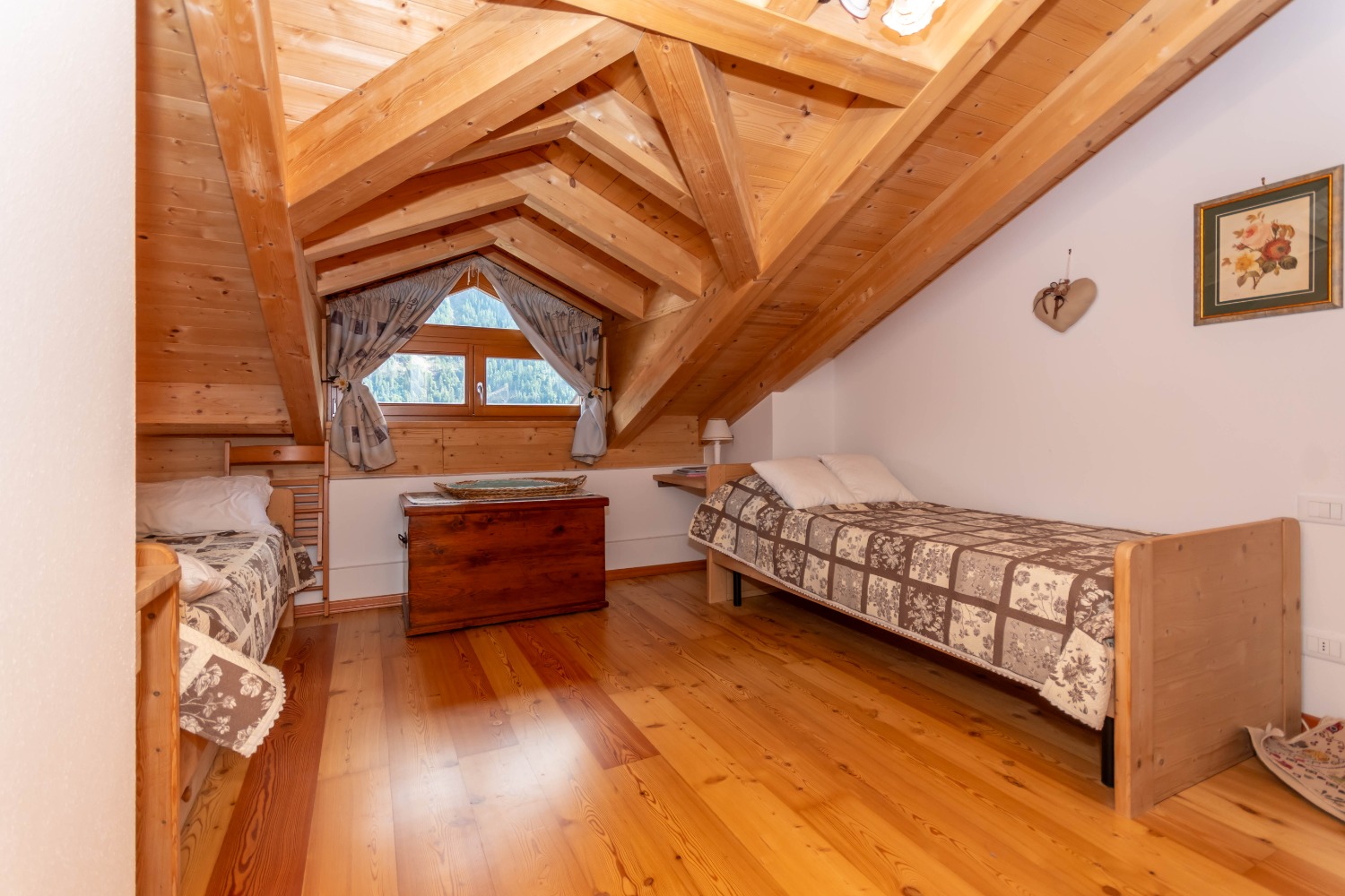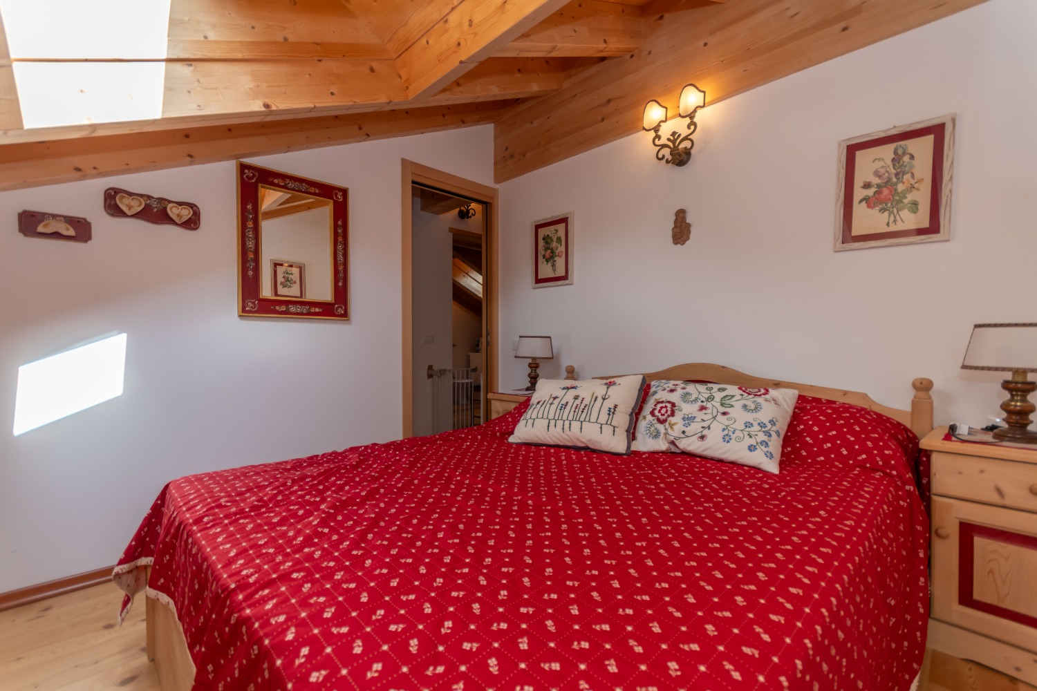 Una scenografica scala in legno conduce alla zona notte, composta da una stanza con letto matrimoniale, una camera con due letti singoli e un secondo bagno completo, perfetto per ospiti o per famiglie.